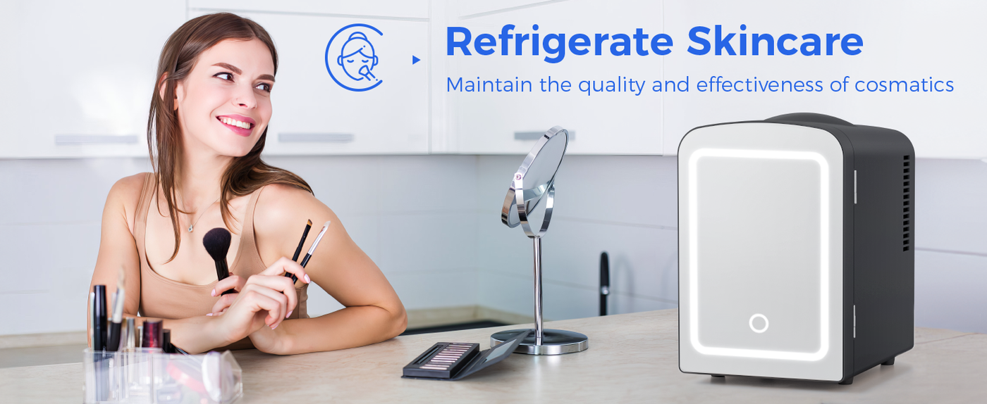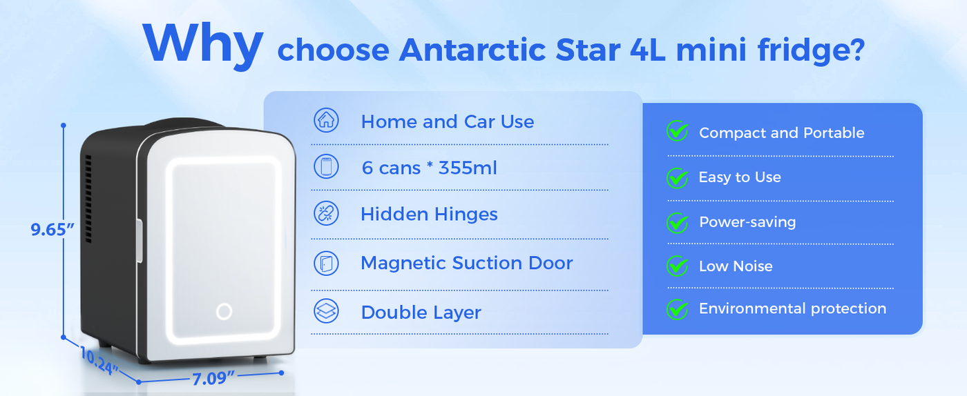 • COMPACT MINI FRIDGE: The Antarctic Star mini fridge is a good choice for you to store foods, drinks, beer, makeup and skincare. Suitable for your bedroom, office, dorm, travel, boating, camping and so on. A dimmable LED light mirror, allows you to make up easily.