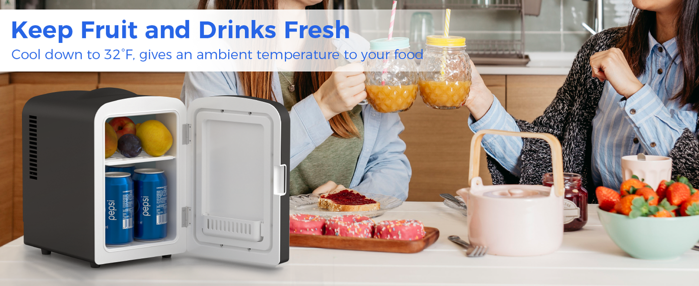• 4L CAPACITY: Store 6 can/12 oz with no worry; dimensions are 9.3"D x 7"W x 10"H; The removable shelf makes the fridge become more flexible to store small items like breast milk, skincare, cosmetic, or food.