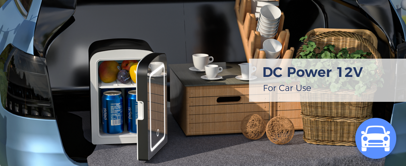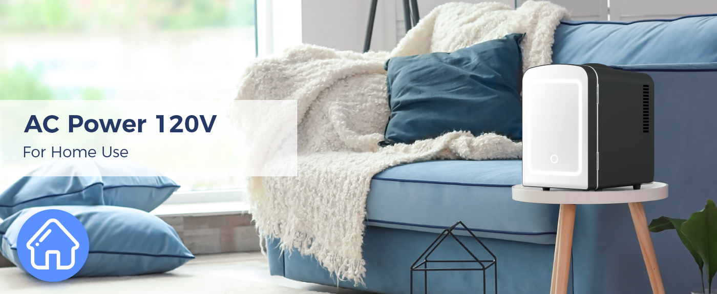 • AC/DC SUPPLY OPTIONS: You can connect the compact refrigerator to a 100-120V home power supply, or you can connect to a 12V car power supply.
