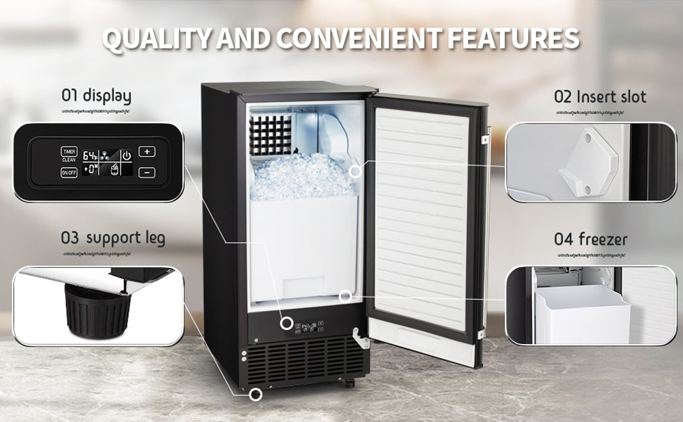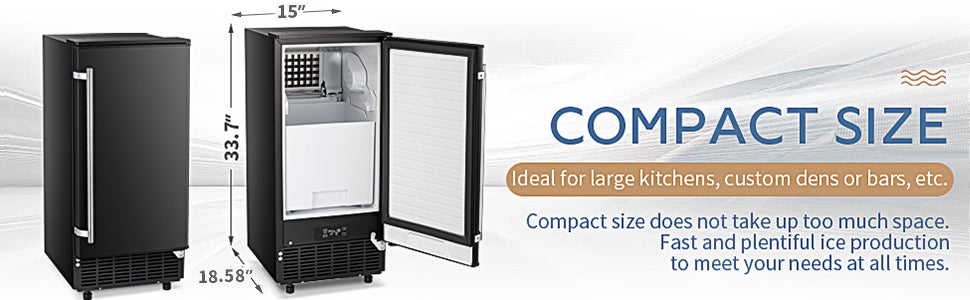- 【Compact Size】The ice maker measures 18.58*15*33.7 inches and can easily fit under standard kitchen and bar countertops, making it perfect for home bars, personalized dens or restaurants. It allows you to serve soda, beer, cocktails or other drinks on the rocks anytime, anywhere.