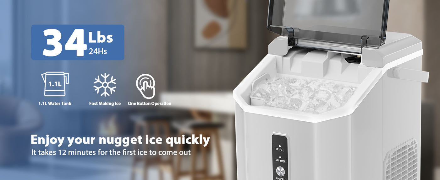 - FAST ICE MAKING:Fill 1.1l of water into the water tank, maximum ice capacity can reach 34lbs in 24 hours. It won't make you feel anxious because of waiting, let you and your family have ice cubes all day long.