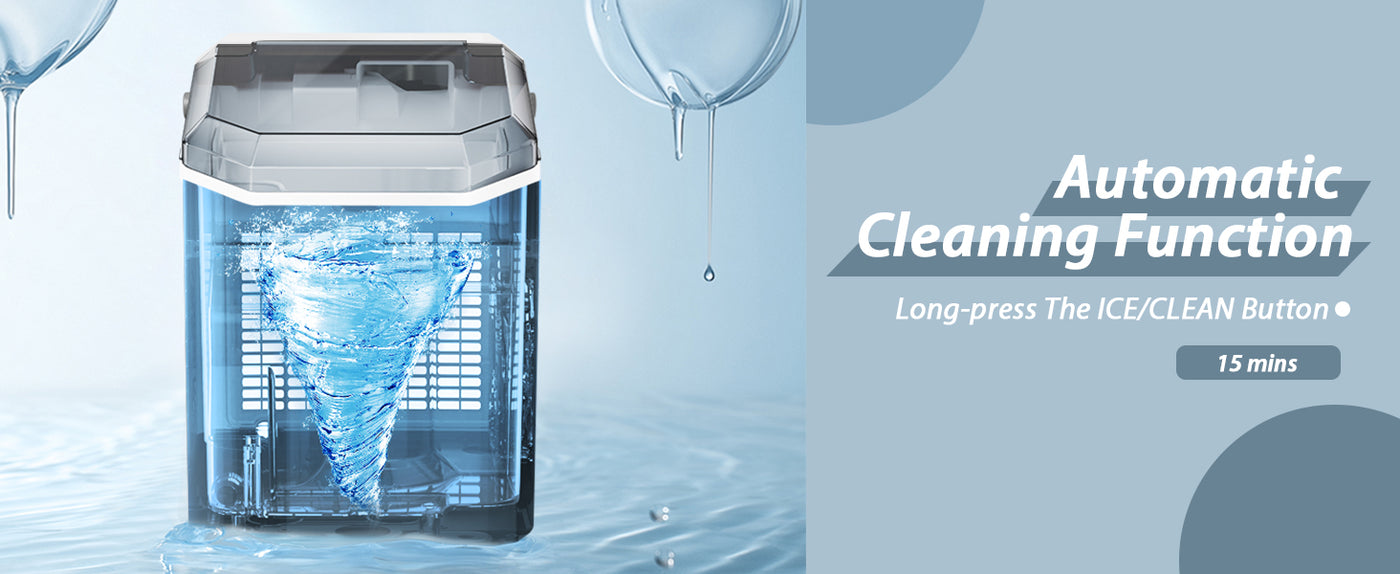 - SELF-CLEANING FUNCTION: Press “ICE/CLEAN” button for 5 seconds, the ring indicator light flashes white. It will run the cleaning procedure for 15 minutes and automatically exit. Press this button again during the cleaning procedure and it will exit immediately.