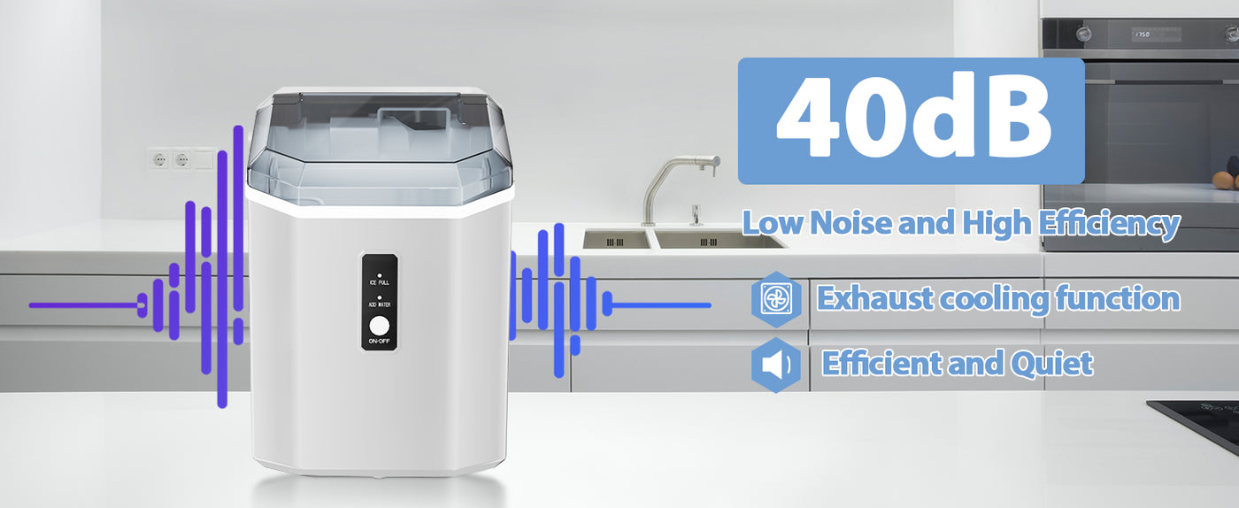 - QUIET AND USER FRIENDLY: It makes ice with low noise. The transparent lid allows you to monitor the ice making process. A considerate ice scoop holder, easy to find your ice scoop before making ice. Only need to press one button, helps you to quickly understand how to use it. When the water is insufficient or the ice basket is full, the indicator light will turn on.