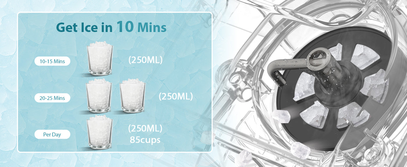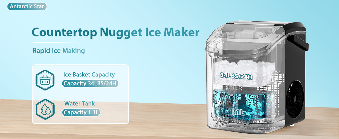- FAST ICE MAKING:Fill 1.1l of water into the water tank, maximum ice capacity can reach 34lbs in 24 hours. It won't make you feel anxious because of waiting, let you and your family have ice cubes all day long.