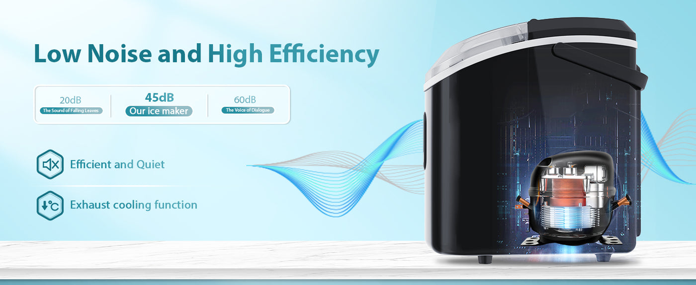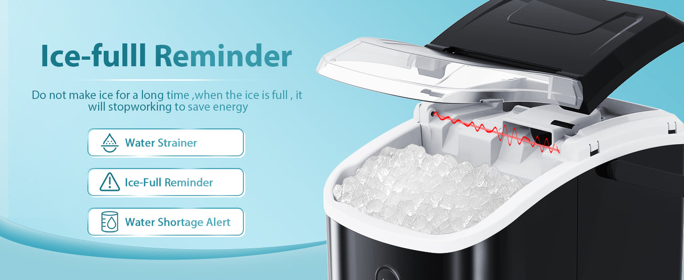 - QUIET AND USER FRIENDLY: It makes ice with low noise. The transparent lid allows you to monitor the ice making process. A considerate ice scoop holder, easy to find your ice scoop before making ice. Only need to press one button, helps you to quickly understand how to use it. When the water is insufficient or the ice basket is full, the indicator light will turn on.