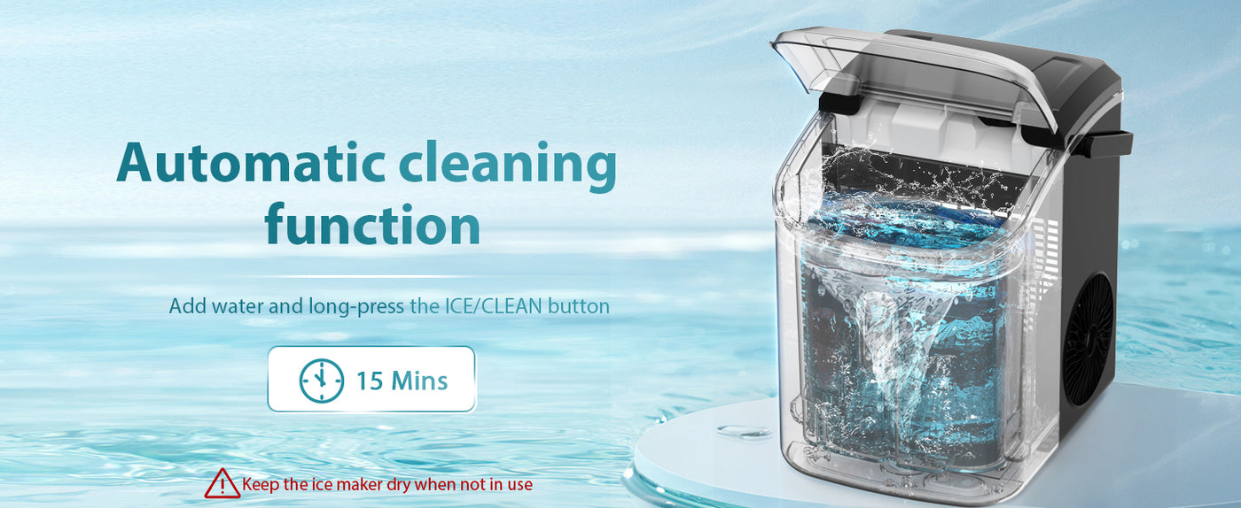 - SELF-CLEANING FUNCTION: Press “ICE/CLEAN” button for 5 seconds, the ring indicator light flashes white. It will run the cleaning procedure for 15 minutes and automatically exit. Press this button again during the cleaning procedure and it will exit immediately.