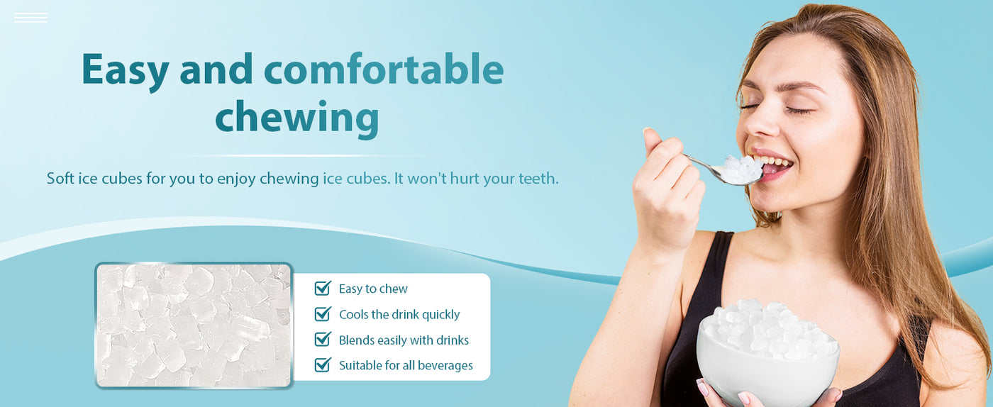 - CHEWABLE NUGGET ICE: Chewing-block ice is made from crushed ice cut with blades, as opposed to traditional hard block ice which are chewable, brittle, ready fast and retains its flavor. The optimal melting speed preserves the original flavor of whisky and cold drinks.
