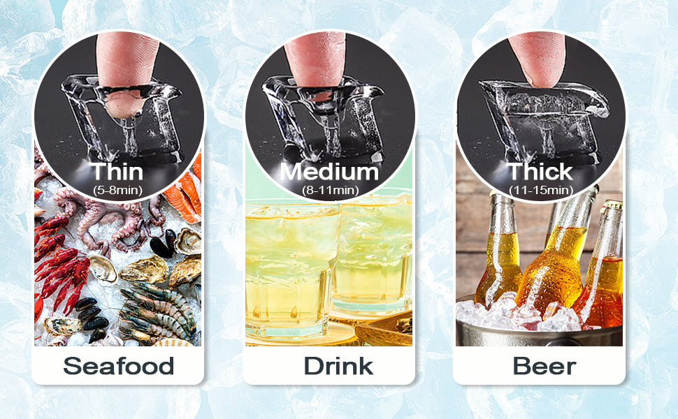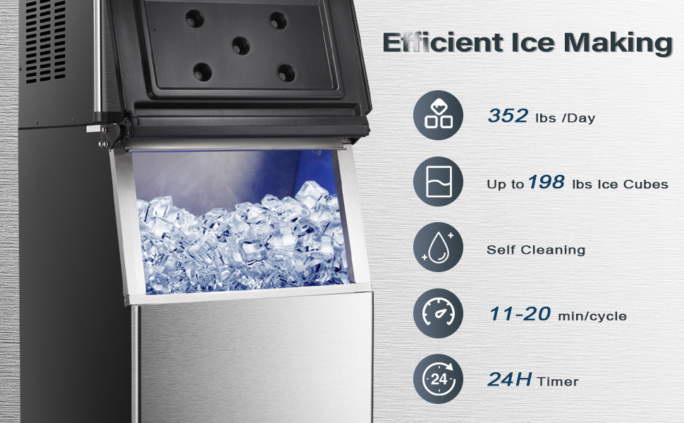 - 【Efficient Ice Maker】160 ice cubes in 11-20 minutes and 352 pounds of ice in 24 hours, which can fill your ice needs and the commercial needs. The ice tank can contain 198LBS ice cubes, a large storage for precious ice. The ice cubes are square and clear like a crystal. The thickness of the ice cubes can be adjusted according to your preference.