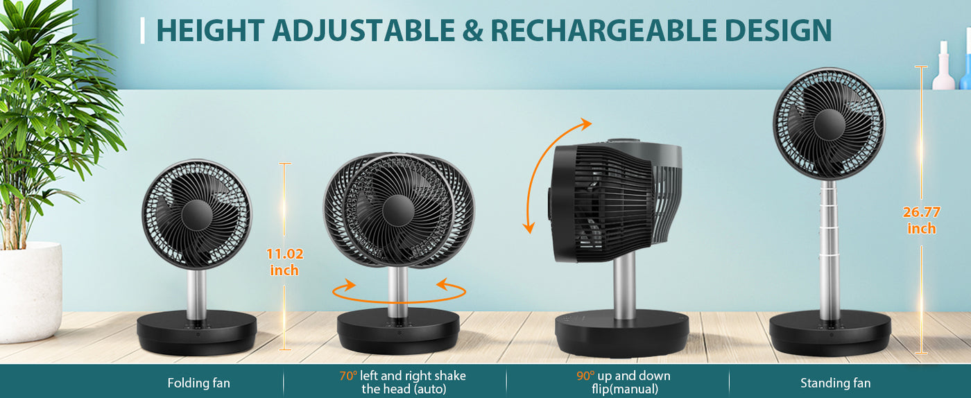 • 【Height Adjustable】Based on its adjustable height, this foldable fan can be used as a freestanding fan or a table fan. You can easily change the fan’s height to 27inch, which also save your money of purchasing a heavy pedestal fan.