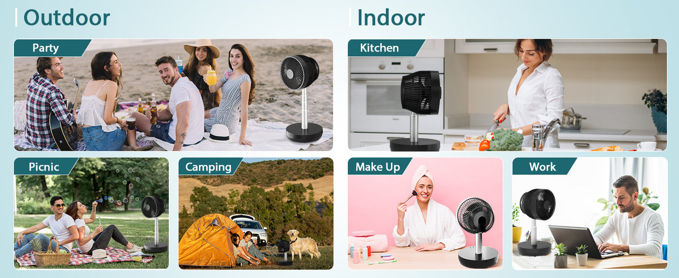 • 【24H Super Long Standby】 This fold away fan is powered by battery with 3600mah, and can continue to use for 24 hours (in the lowest wind mode) at a time. Long standby is enough to meet the needs of daily use. At the same time, it can also serve as a power bank to charge mobile phones and other devices for emergency use, which makes you very convenient.