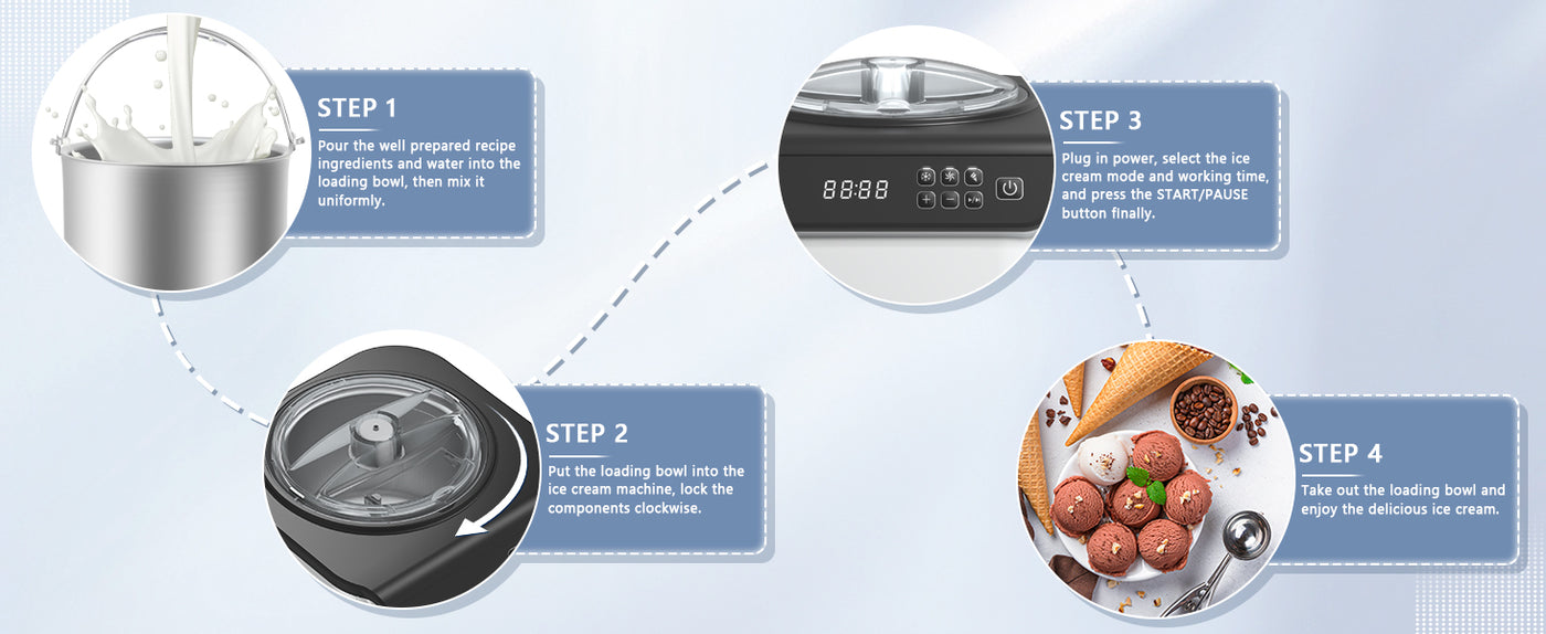 • 【EASY TO USE】: The ice cream maker has a LED screen. Operation only requires 6 buttons. You just need to pour the material into the container, close the lid, and select the function. Then just wait the food and enjoy it. While the food is being prepared, you can do other things without being around it. You can see the remaining time on the screen.