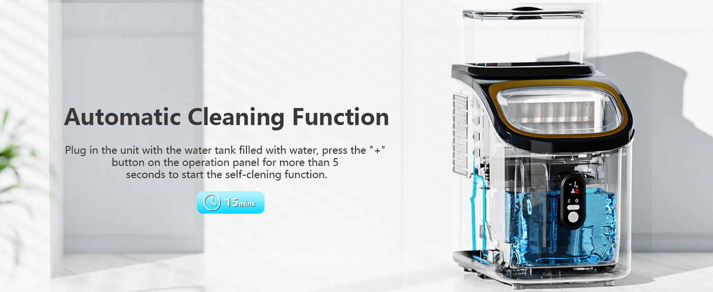 - 🧊Automatic Cleaning Function: Designed for convenience, the machine boasts an automatic cleaning feature that saves you time and effort, keeping the interior hygienic and ready for the next batch of ice.