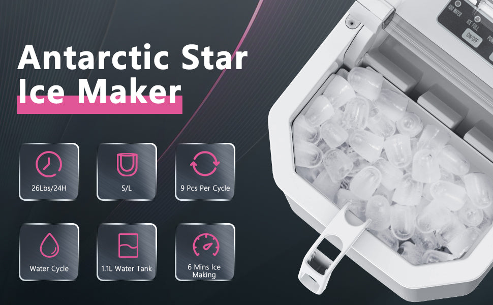 - FAST MAKER- Antarctic Star countertop ice maker has a powerful and fast ice making capacity. Makes batches of ice cubes in about 26 lbs of ice in per day and Makes batches of ice cubes in about 6-13 mins. Don't worry about running out of ice. Especially in the hot summer, you can enjoy drinks and beer with ice cubes. Note: For normal use, please must let machine stand upright for 4 hours before first use.
