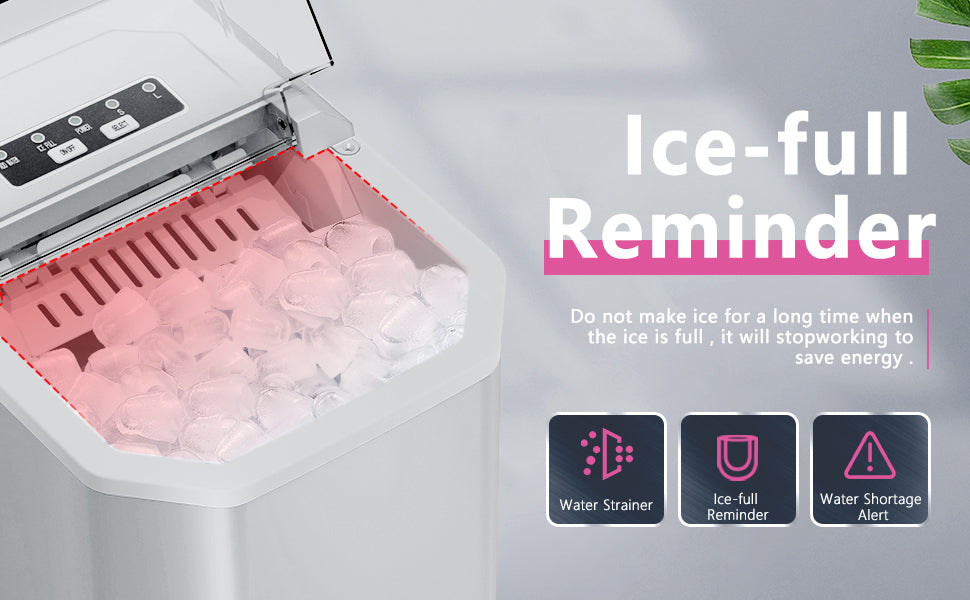 - INTELLIGENT LED DISPLAY- Let's you know the time to add the water, it's equipped with alarm light and automatic shutdown function, take out the ice cubes, the machine will automatically start go into the ice-making mode. You just plug in to main and add some water, then press the button. Large translucent window for easy observation. It's also comes with a removable ice basket and scoop, convenient for you to transfer ice cubes to your drink or ice bucket.