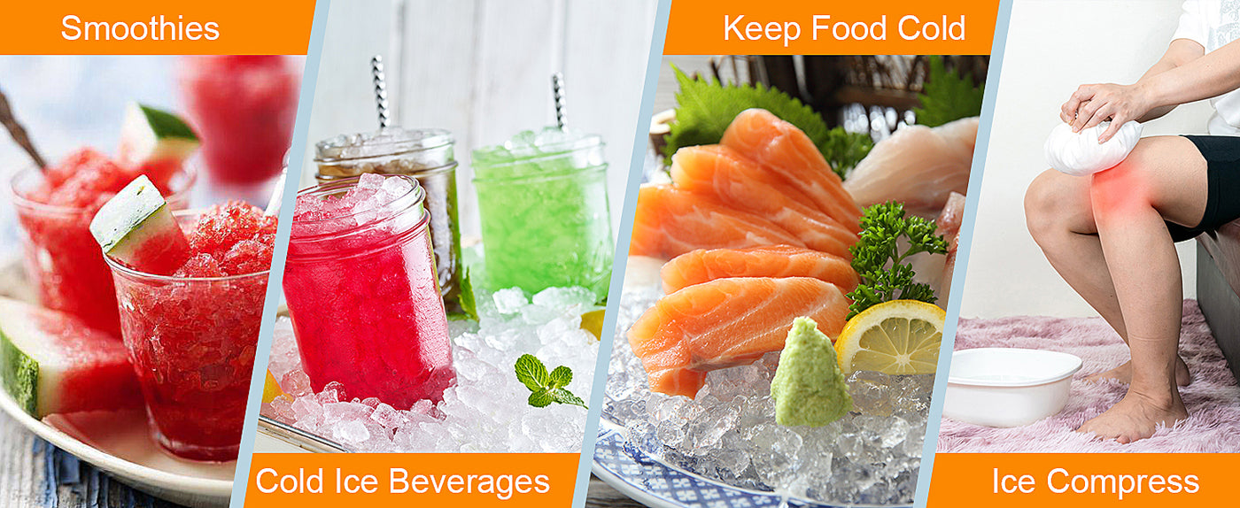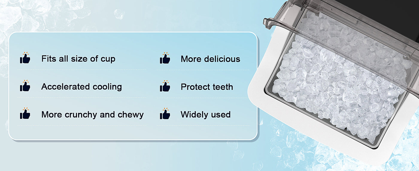 - CHEWABLE NUGGET ICE: Chewing-block ice is made from crushed ice cut with blades, as opposed to traditional hard block ice which are chewable, brittle, ready fast and retains its flavor. The optimal melting speed preserves the original flavor of whisky and cold drinks.