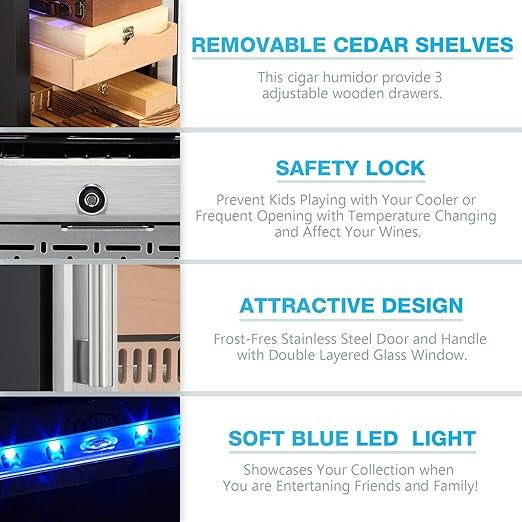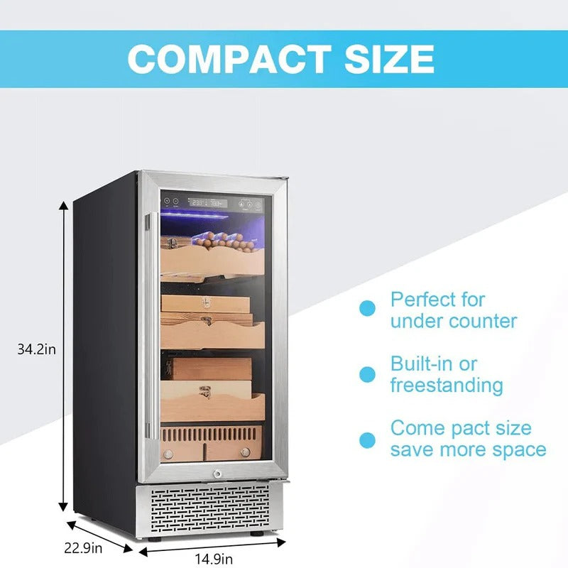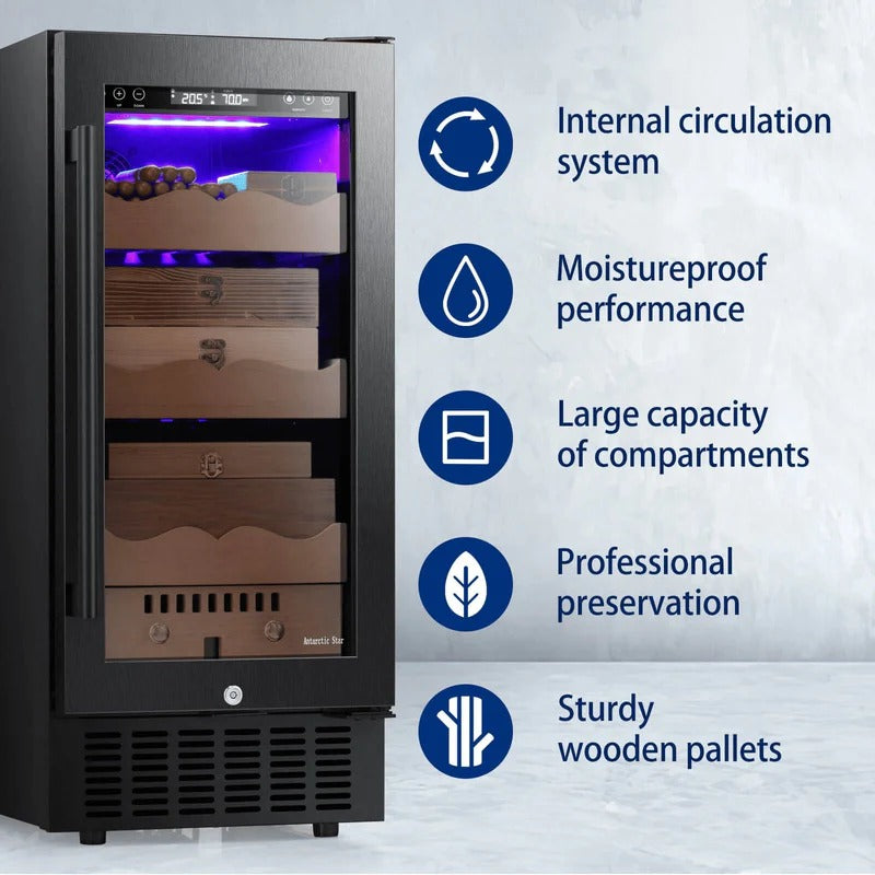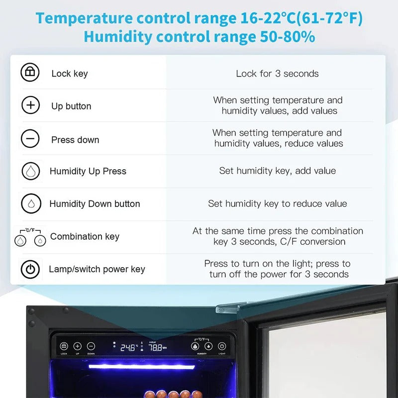 Electronic Control- This electronic cooler helps avoid temperature and humidity fluctuations stored in a natural environment and provides a user-adjustable temperature range (61-72℉), Humidity control range 50-80%,suitable for longer storage and better flavor taste.