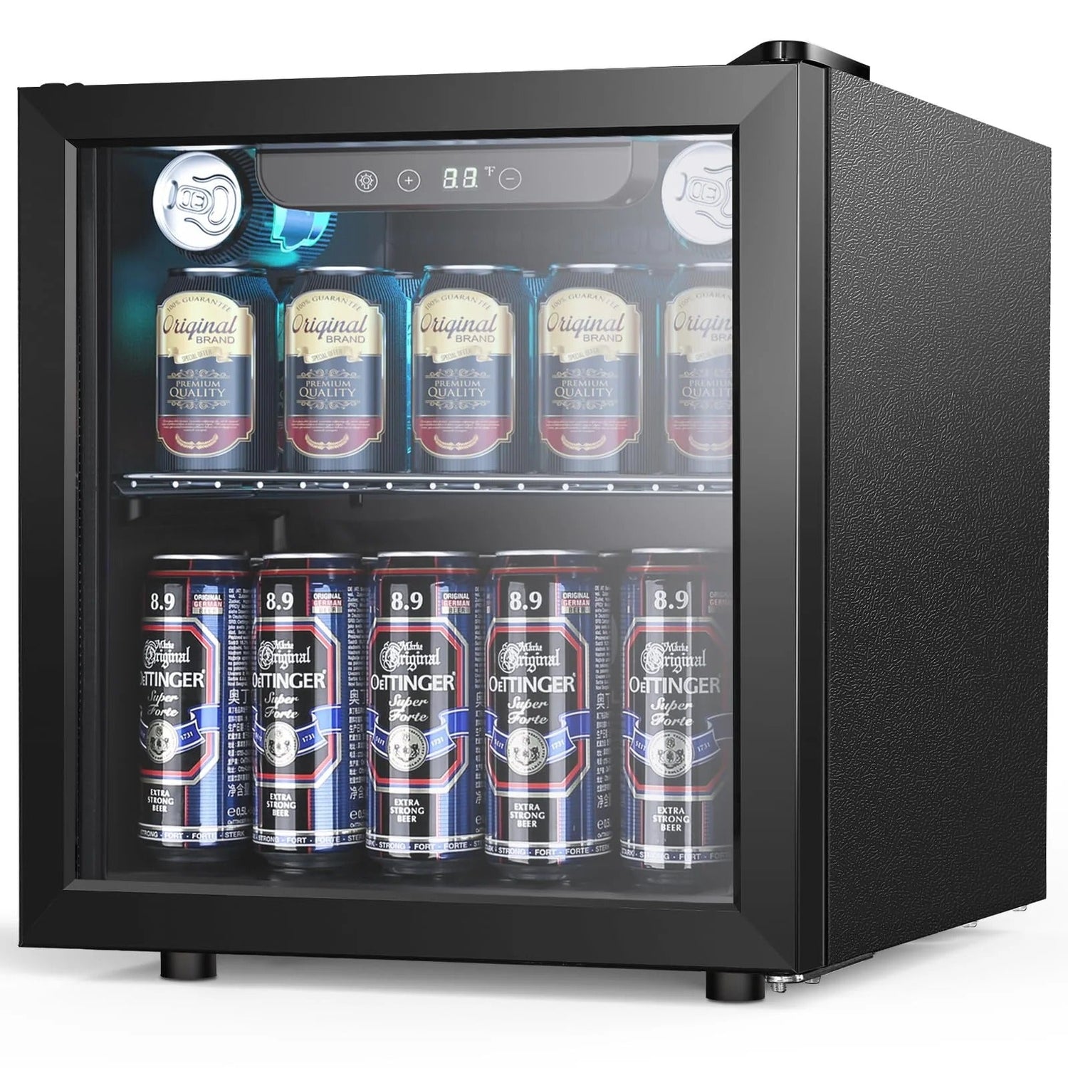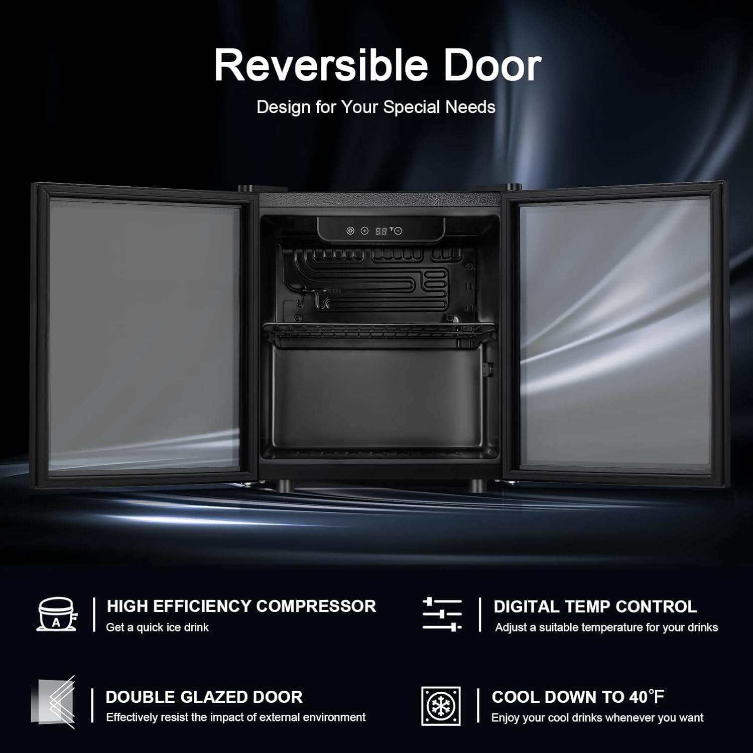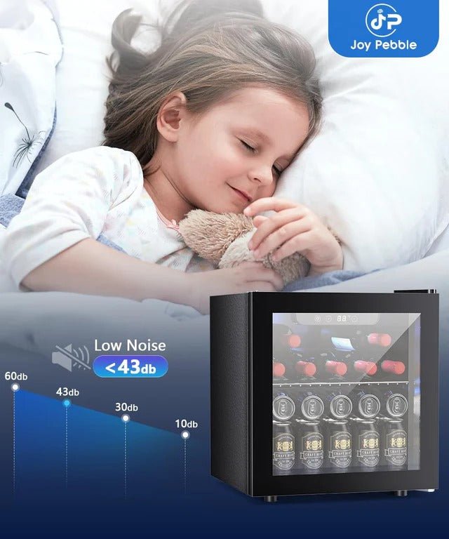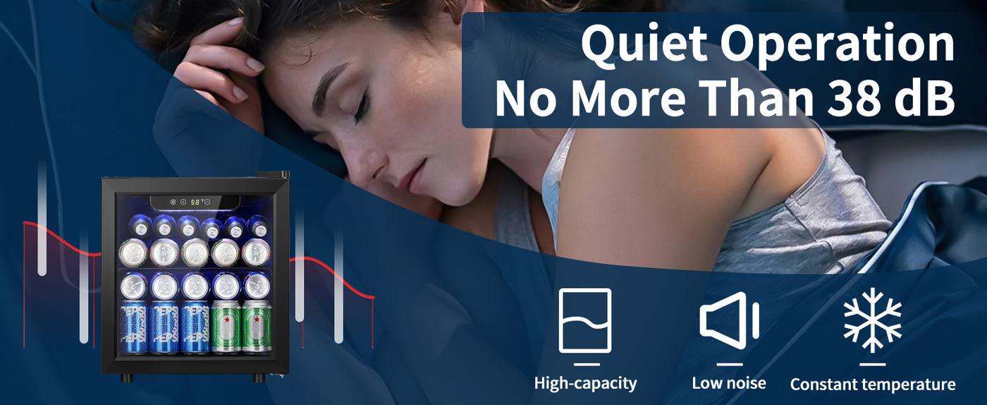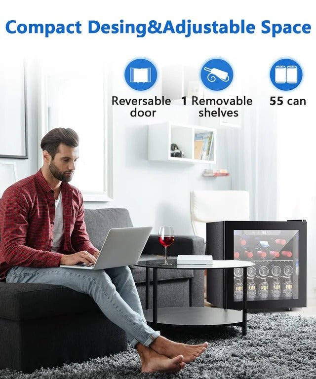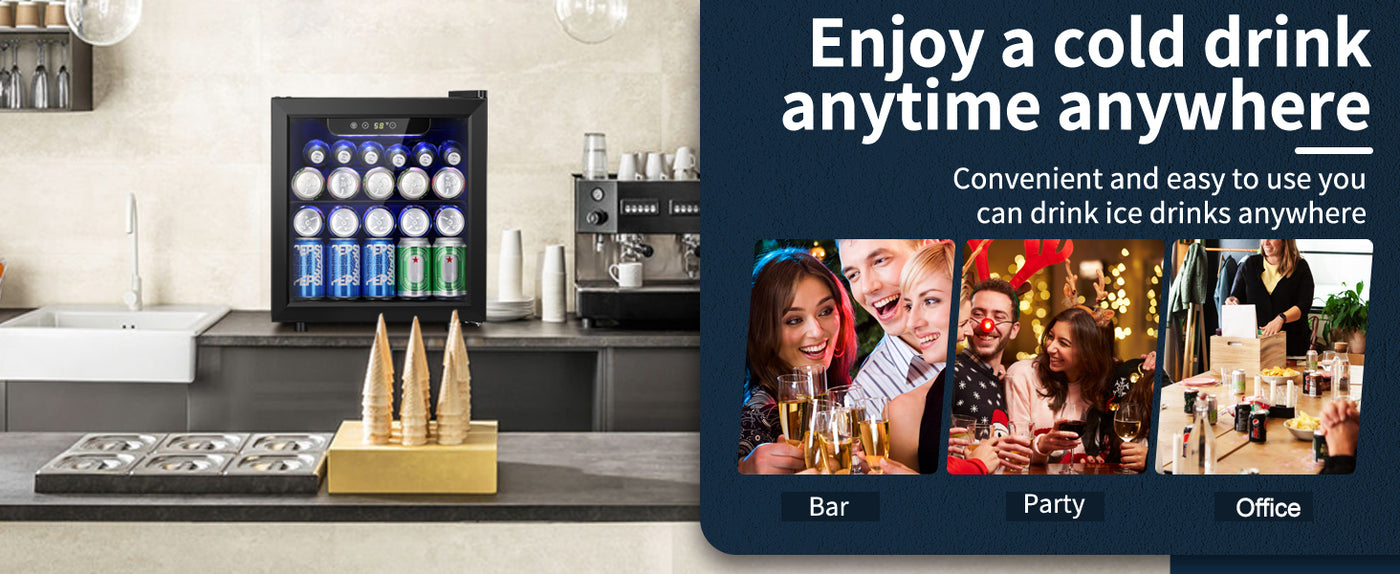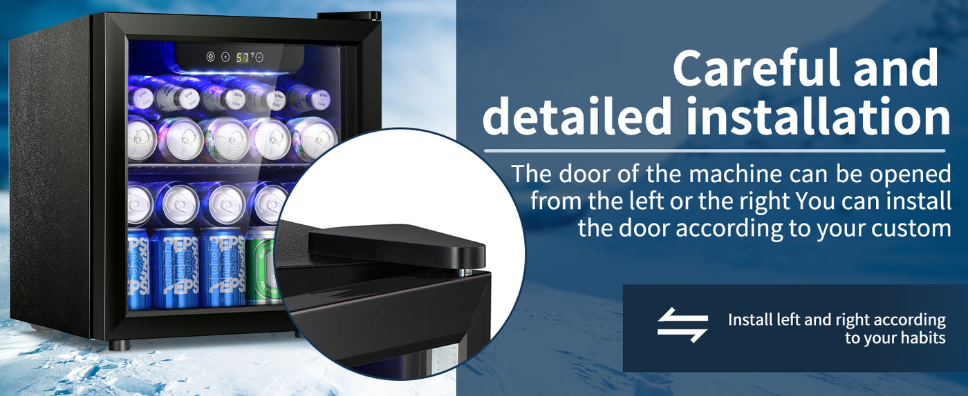 - IDEAL BEVERAGE COOLER: 16.46"D x 16.93"W x 18.5"H mini refrigerator can keep a variety of canned drinks or wine chilled without taking up too much space at your home, dorm, bar or office. It can conveniently hold 48 standard-sized drink cans or 12 standard-sized drink bottles. The interchangeable design of the left and right doors facilitates the selection of storage locations, adapts to the high-quality needs of different people and different locations.