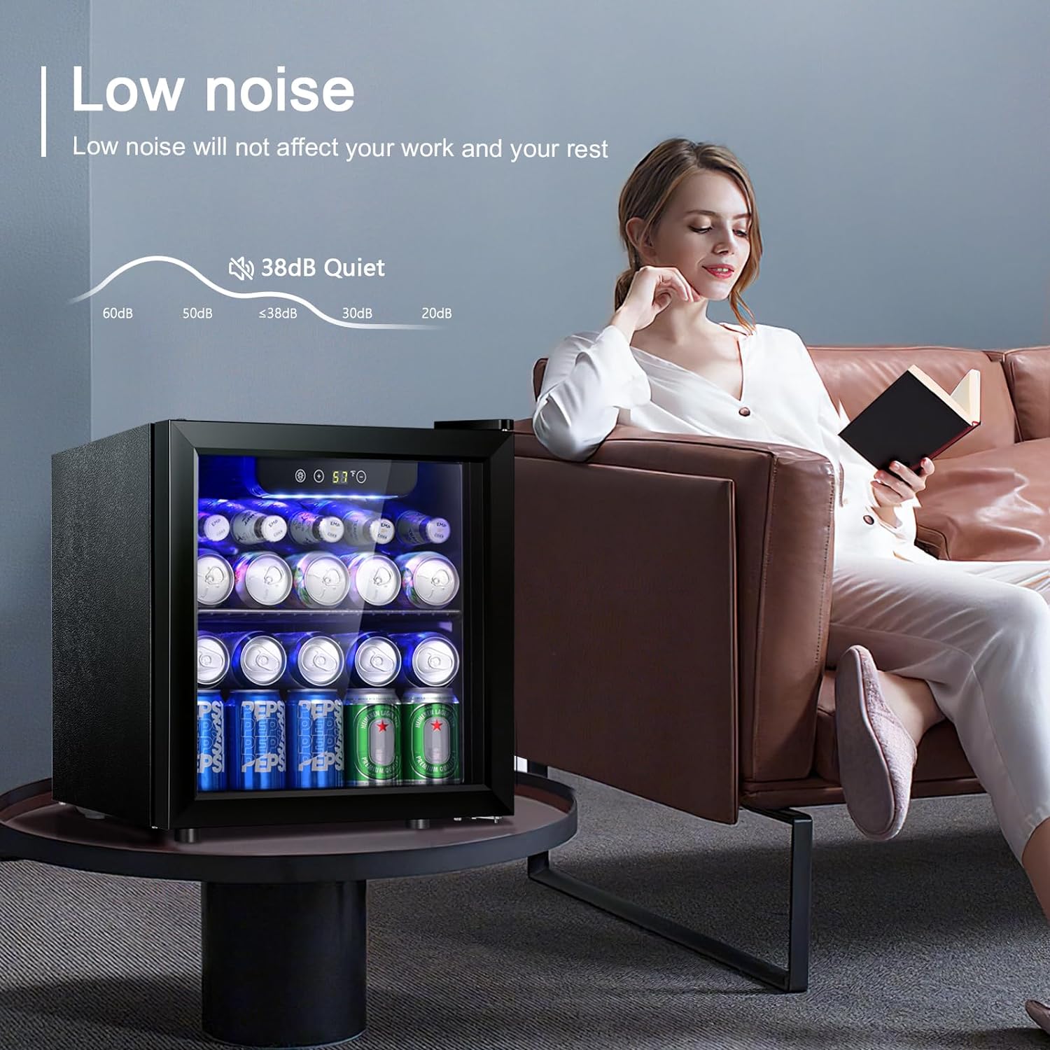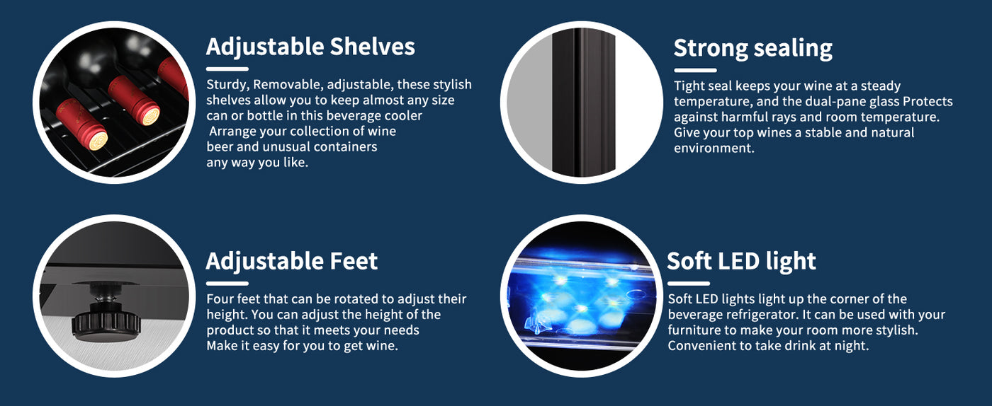 - IDEAL LIGHT and HUMIDITY: With its reinforced glass door with air tight seal and help to maintain an ideal humidity level, this beverage refrigerator gives you a compact and modern design perfect for your living room. Blue soft LED interior lighting not only beautifully showcases the wine but won’t damage the wine.