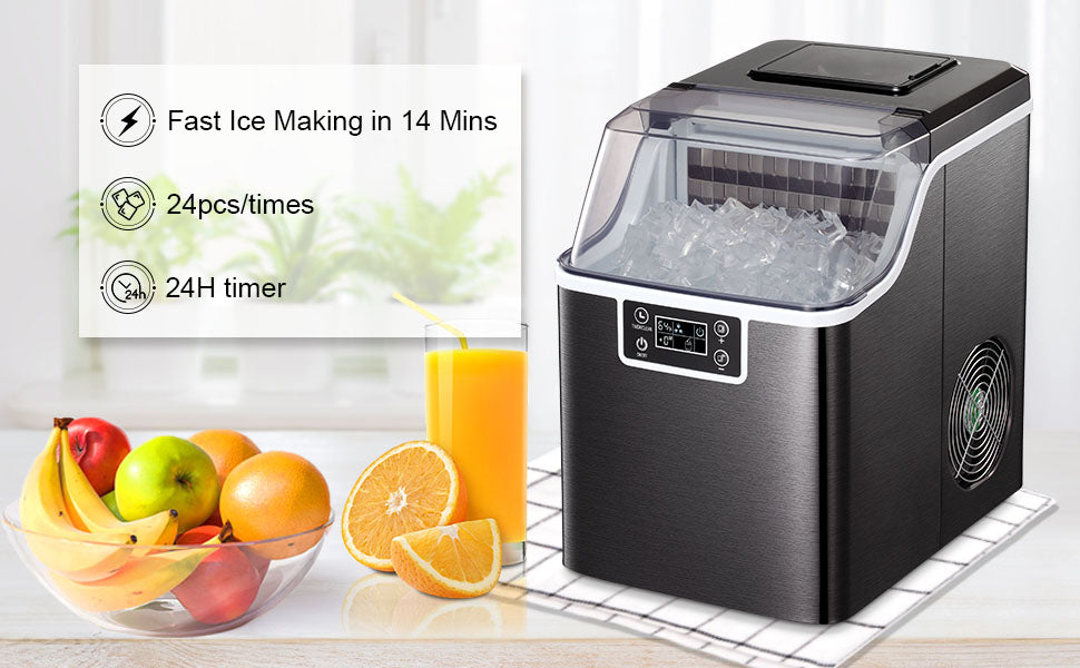 - 【Fast Ice Making】This ice maker can make 24 ice cubes in 8 minutes and 53lbs of ice in 24 hours, which can fully meet your ice needs. The water tank of the ice maker has a capacity of 3.2 liters. The ice cubes are square and clear. The thickness of the ice cubes can be adjusted according to your preference.