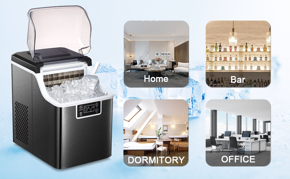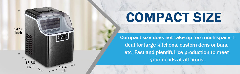 - 【Portable Ice Maker】The size of this ice maker is 13.86*9.84*14.96 inches. with portable and compact design, easy to carry and operate. The device is suitable for kitchen, office, store and bar or other hotels, dormitories and other places. It allows you to drink soda, beer, cocktails or other beverages on ice anytime and anywhere.