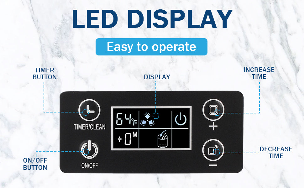 - 【Automatic Cleaning & Timer】The ice maker will produce some dirt inside after long time use, which is troublesome to clear, so we thoughtfully designed the automatic cleaning function. In order to ensure the normal and clean use of the ice machine, you need to turn on this function regularly to clean the ice machine. In addition, we also designed a timer, you can set the timer through the control panel.