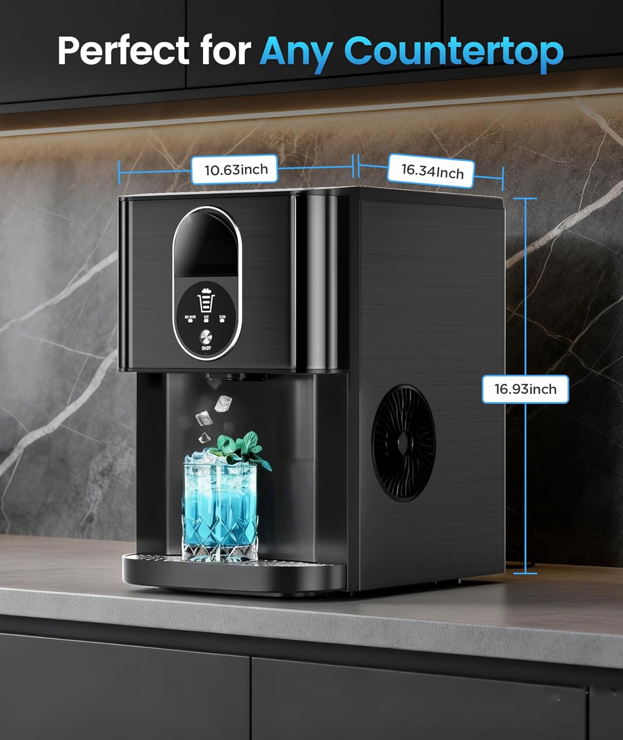 - SMALL FOOTPRINT: This ice maker measures 18.18"D x 12.52"W x 18.89"H. Large Capacity Based on Small Footprint, Small Enough to fit on most countertop and easy to store when not in use. It takes up less space at home or in the office, barbeques, outdoor parties, or basement bars.